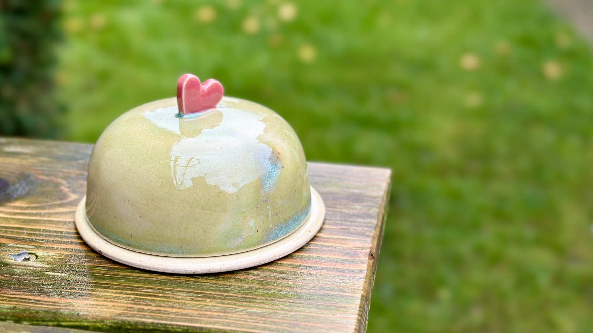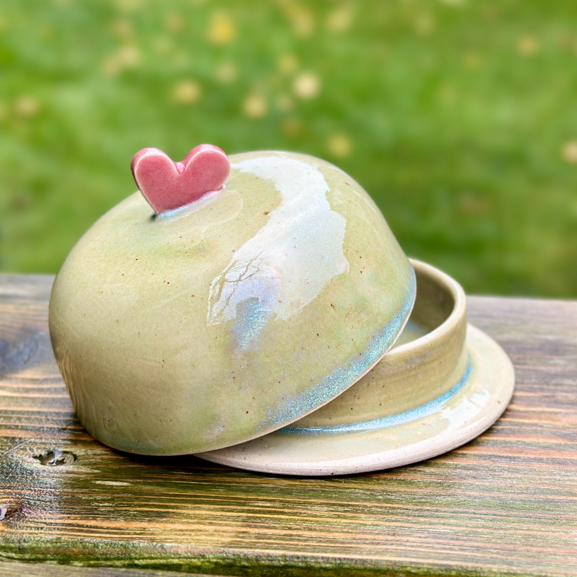 Groen geglazuurd met fijne kleurschakeringen, gedecoreerd met zachtrood hartje als dekselgreepje.