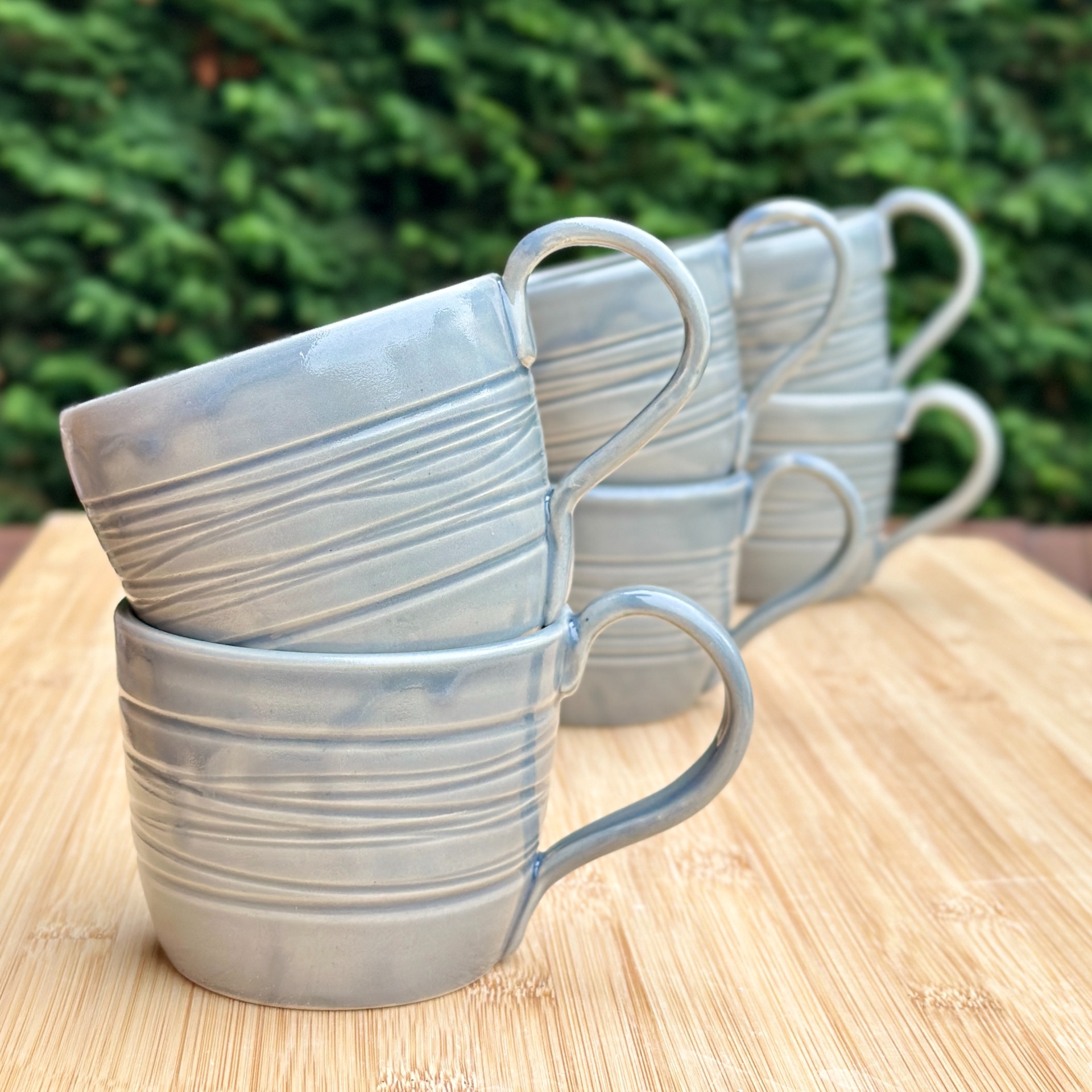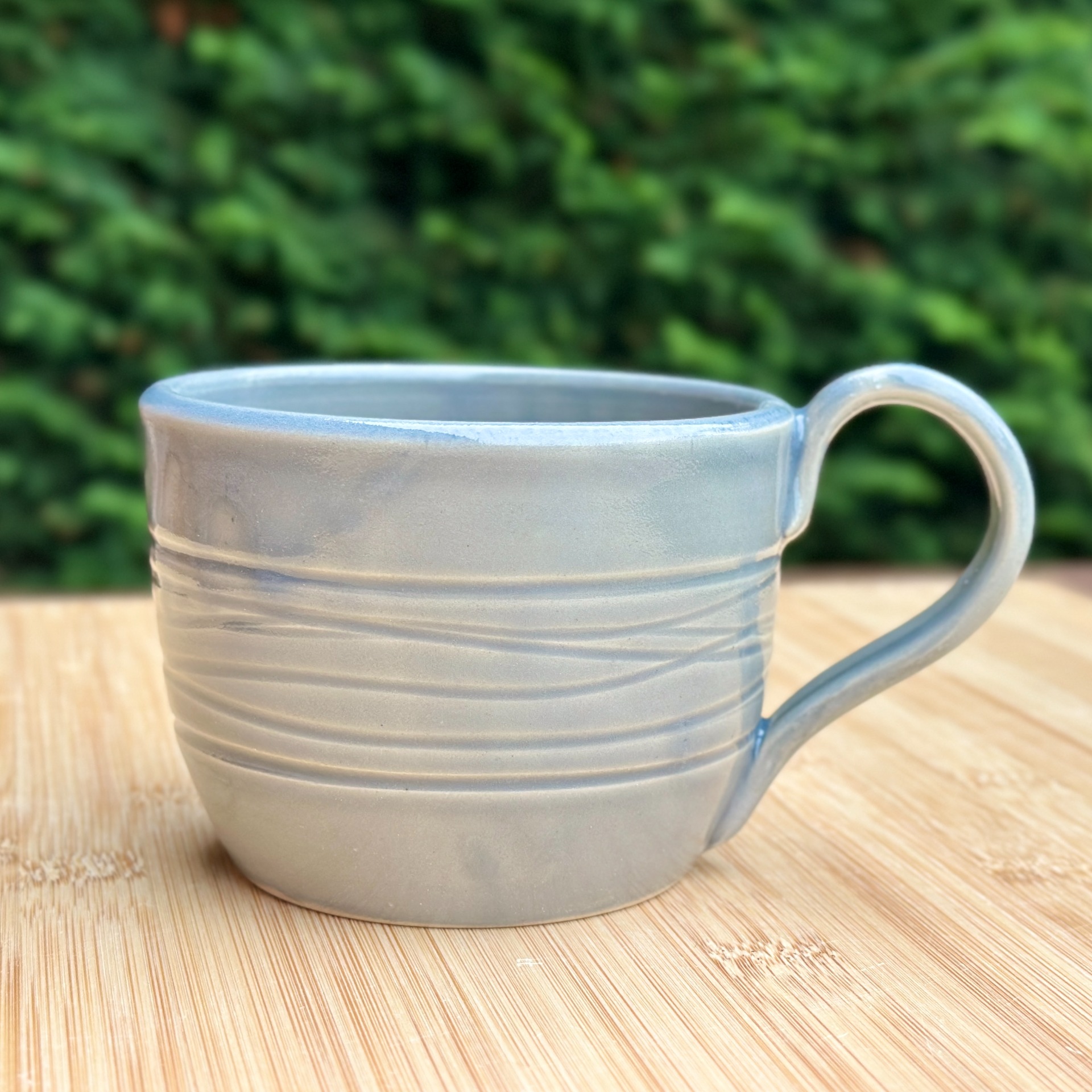 Blauwgrijs geglazuurd en gedecoreerd met speels lijnmotief.